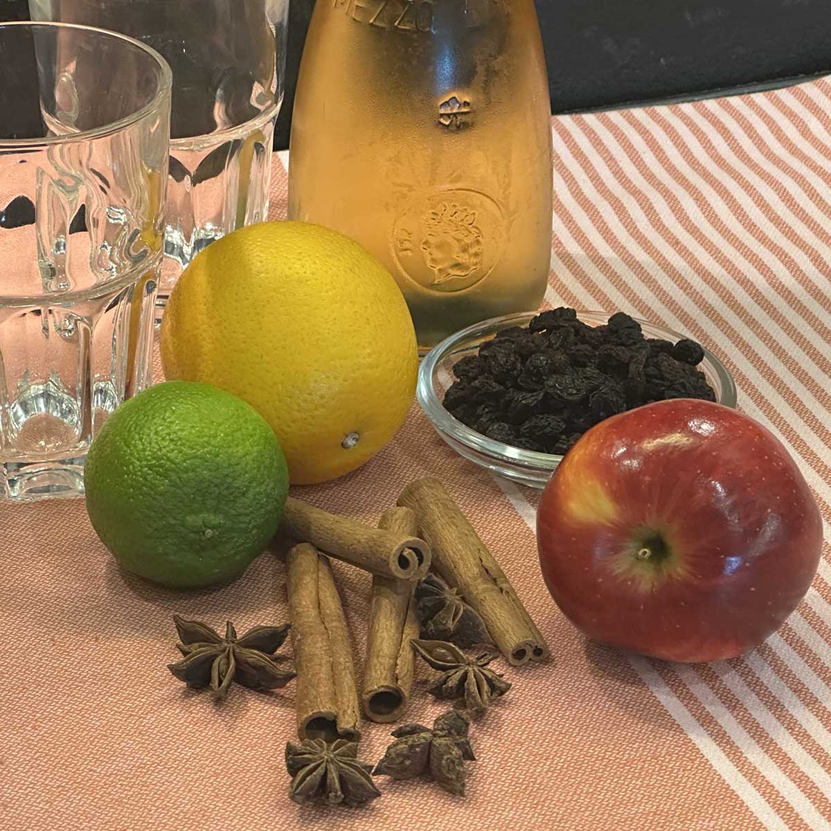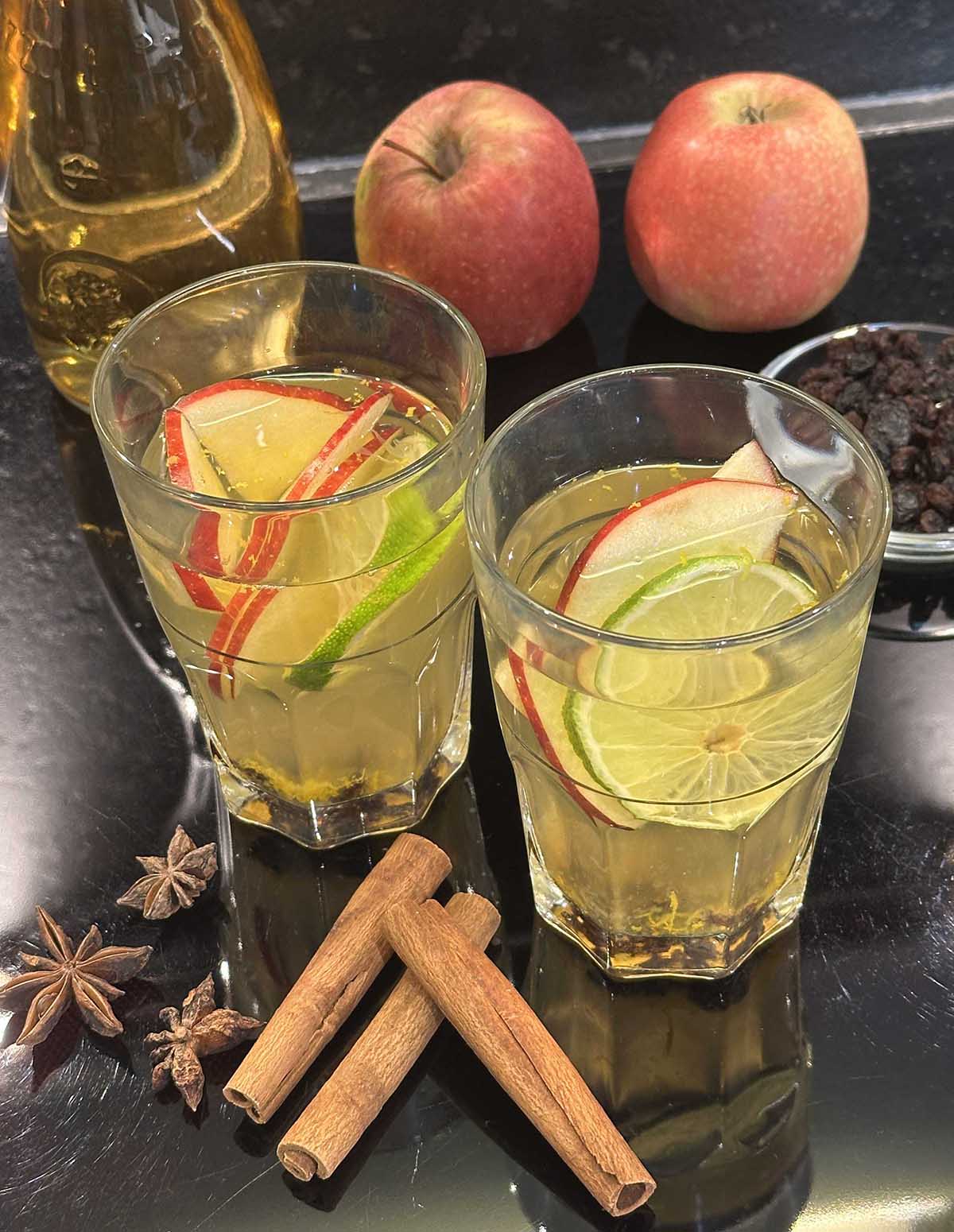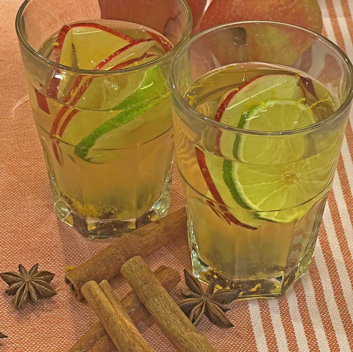 Sorgt für gemütliche Stimmung: warmer Apfelsaft mit frischgepresstem Orangensaft, Zimtstangen und Sternanis, pikant gewürzt mit Limetten, Orangenschale und Limetten-Sirup.