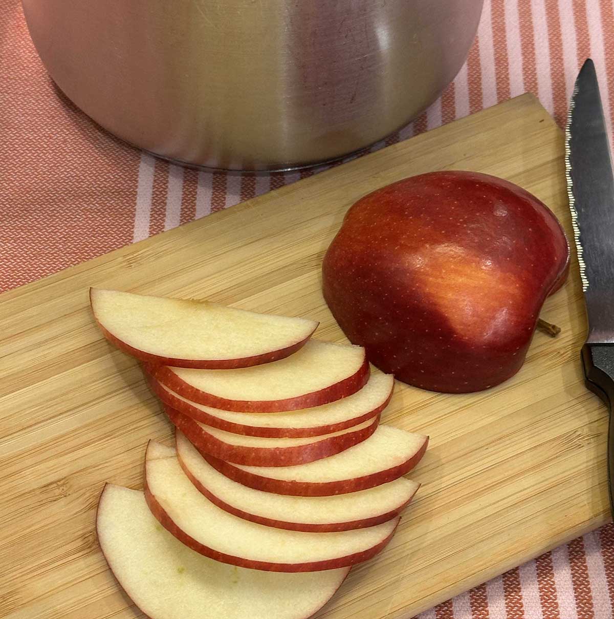 Apfel waschen, mit der Schale halbieren und in dünne Scheiben schneiden.